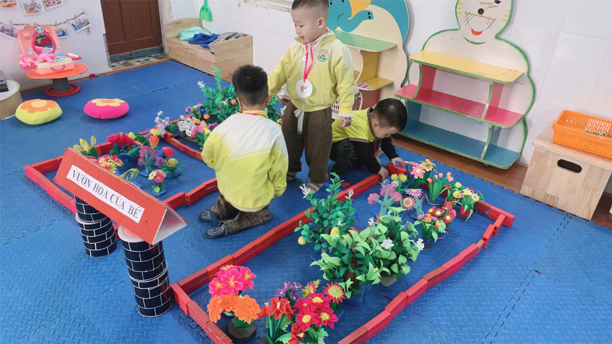 Kết hợp với các góc khác: Ví dụ sau khi xây chợ, trẻ có thể kết hợp góc phân vai để "bán hàng".