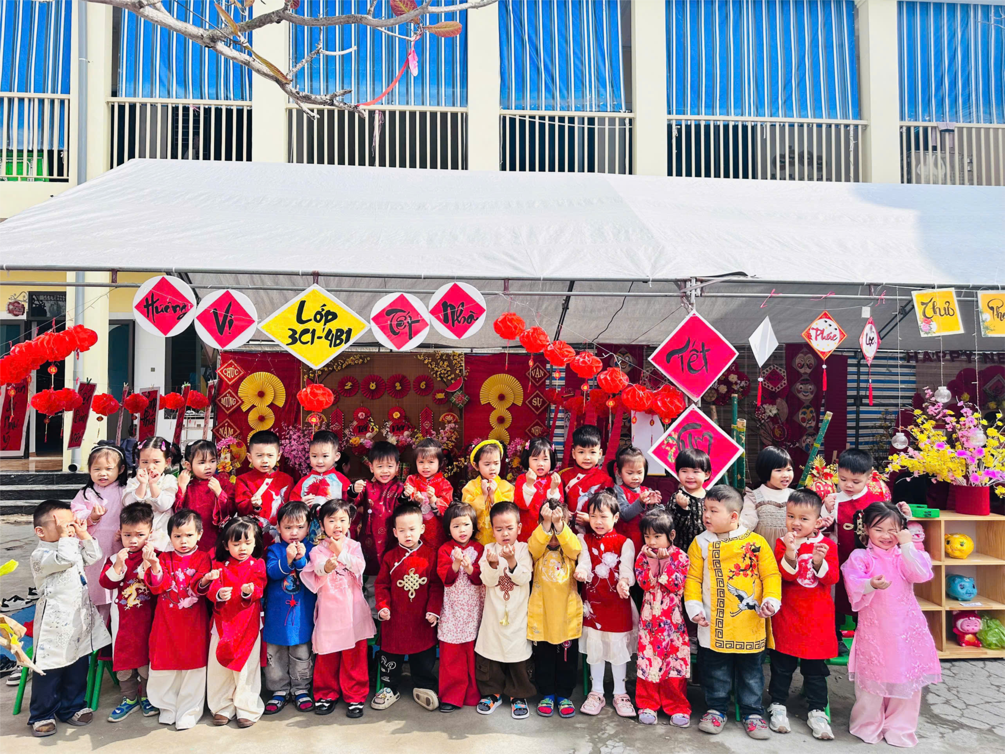 Ngay từ sáng sớm, sân trường đã ngập tràn sắc xuân với cờ hoa rực rỡ, câu đối đỏ, cành đào, cành mai và những gian trại được trang trí sáng tạo, mang đậm không khí Tết cổ truyền. Mỗi lớp là một “gian hàng xuân” nhỏ xinh, được cô và trò cùng nhau chuẩn bị công phu, thể hiện sự khéo léo và tinh thần đoàn kết.