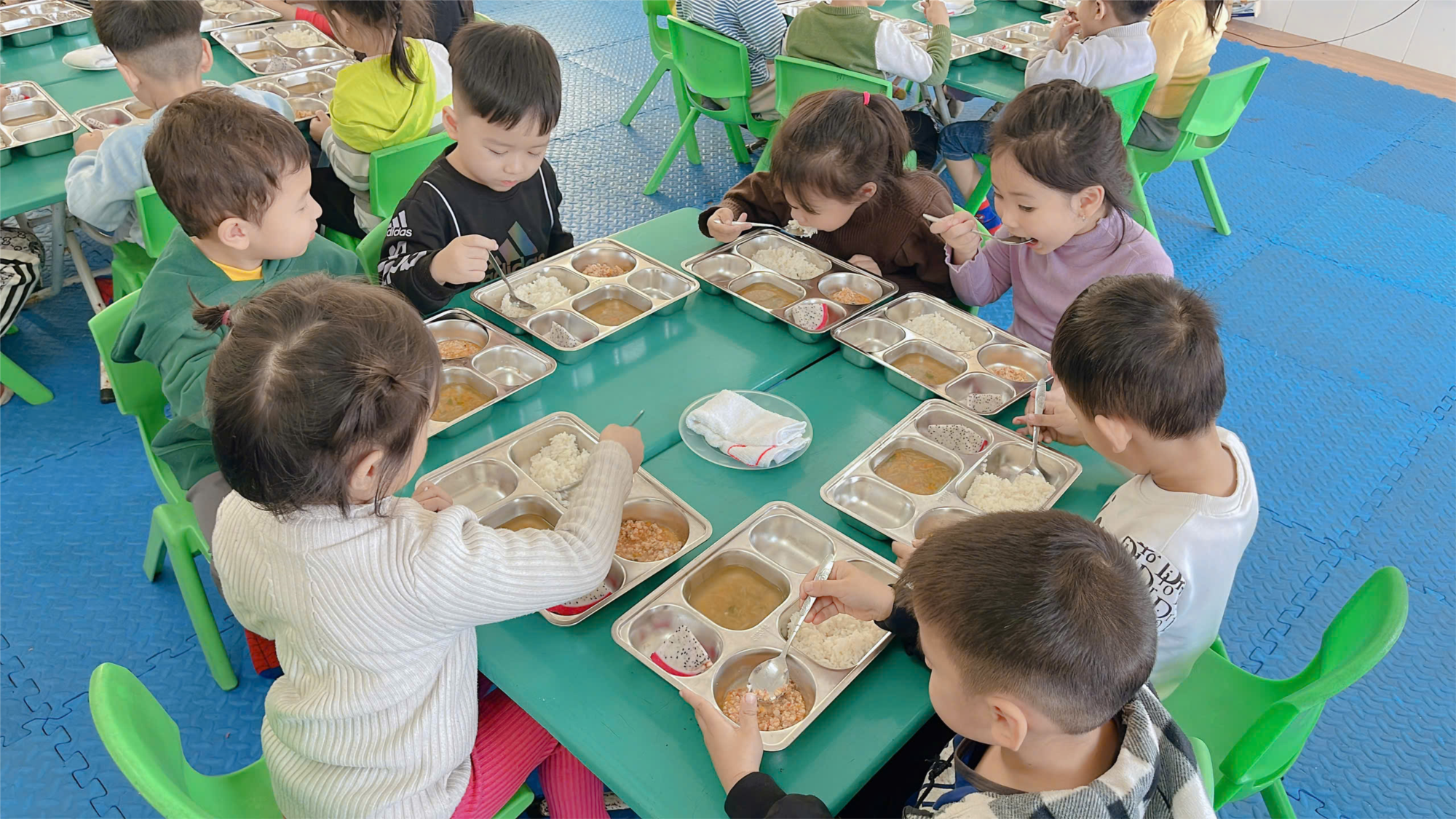 Tổ chức giờ ăn cho trẻ ở trường mầm non là một trong những hoạt động quan trọng, bởi bữa ăn tại trường cung cấp một phần thiết yếu về dinh dưỡng và năng lượng cho cả ngày của bé. Trẻ có chế độ dinh dưỡng tốt sẽ là nền tảng cho sự phát triển toàn diện cả về thể chất lẫn tinh thần. Bên cạnh chế độ dinh dưỡng trong bữa ăn thì việc vệ sinh trước, trong và sau khi ăn có vai trò quan trọng trong việc hình thành thói quen cho trẻ, giúp trẻ phát triển toàn diện về nhân cách sau này.