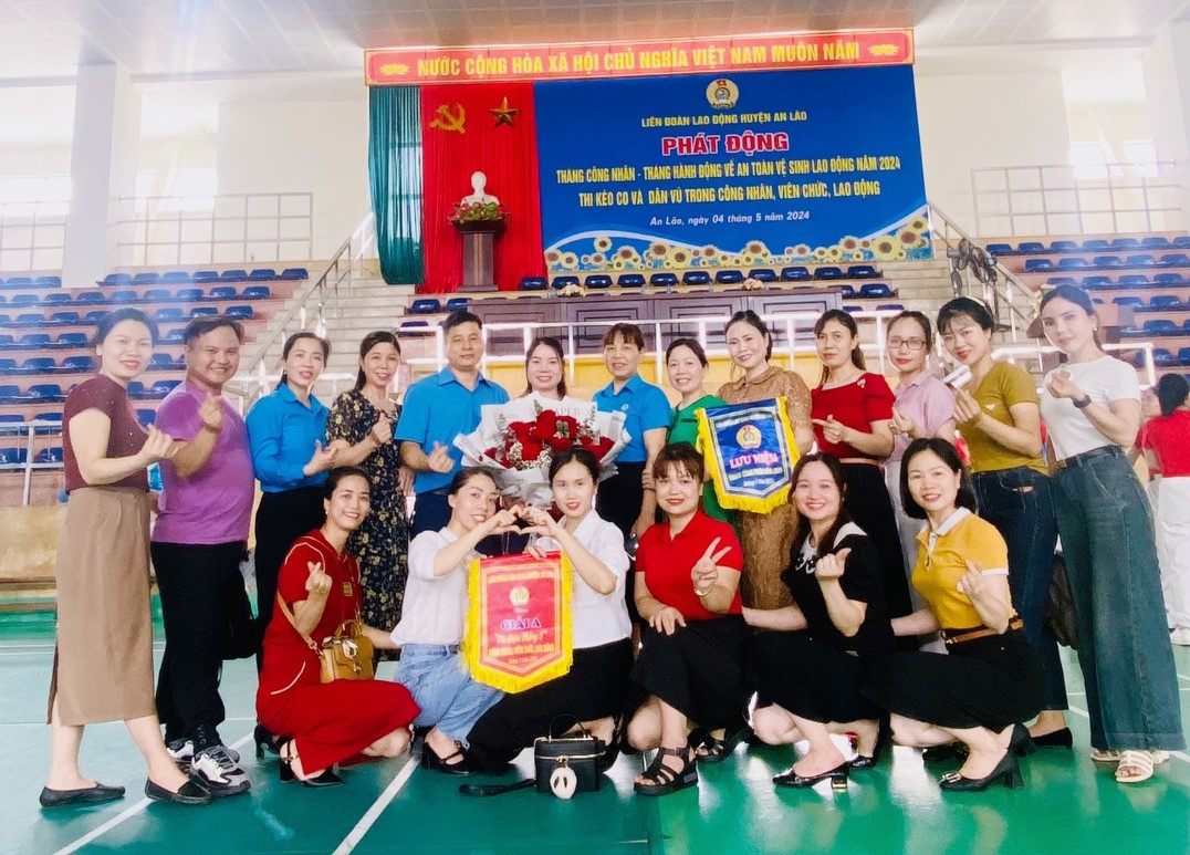 Hình ảnh tập thể CBGV- NV của đội dân vũ chụp ảnh lưu niệm cùng các cán bộ LĐLĐ Huyện An Lão