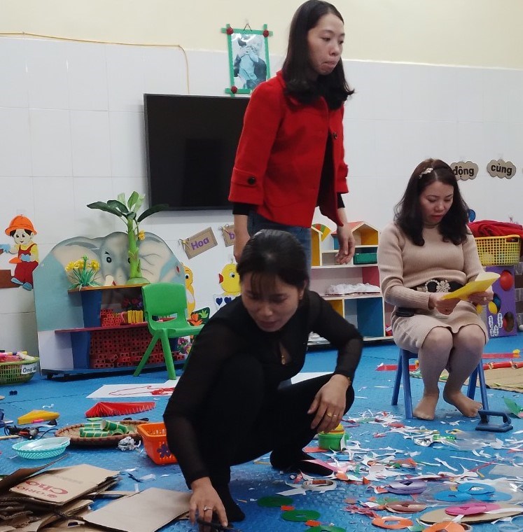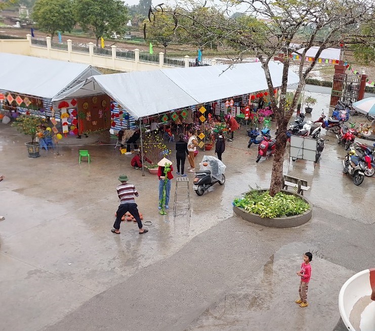 Hình ảnh chuẩn bị hội chợ xuân của các giáo viên trường Mầm Non Tân Viên