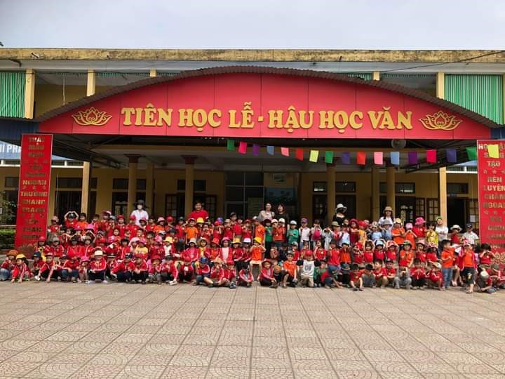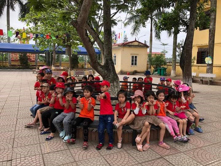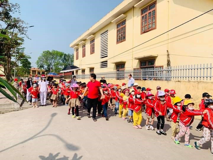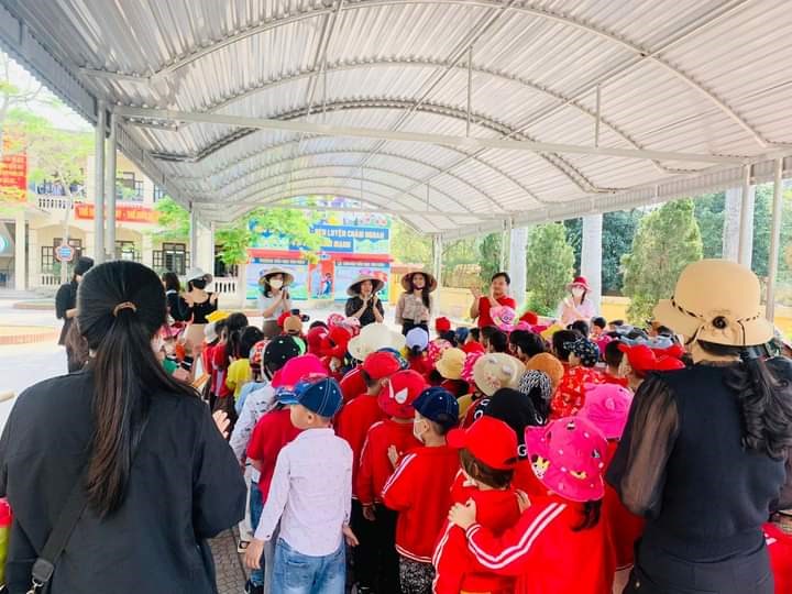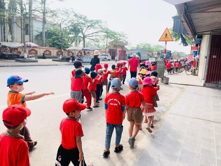Đúng 7 giờ 20 phút các bé khối Lá tay trong tay với đồng phục đỏ caro gọn gàng tập trung trước sân trường để cùng với GVCN chuẩn bị cuộc hành trình đến Trường Tiểu học Tân Viên.