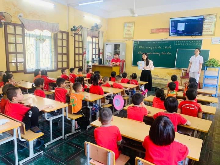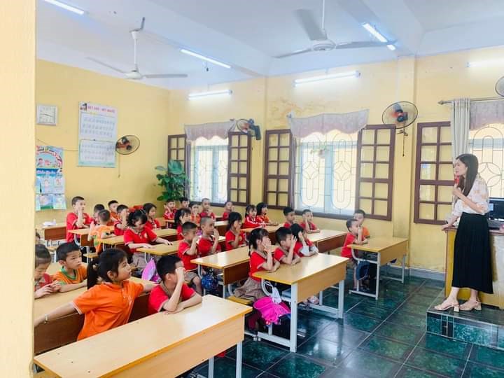 Lắng nghe cô hiệu trưởng của trường tiểu học Tân Viên giới thiệu về trường, về lớp học, về đồ dùng học tập và các hoạt động học tập ở trường tiểu học khác với ở trường mầm non như thế nào. Qua đó, giúp các bé có thêm hiểu biết về trường Tiểu học và các hoạt động học tập.