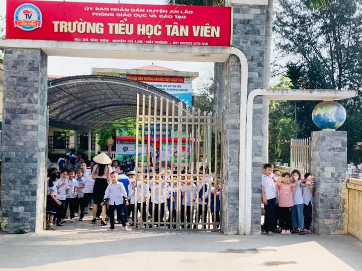 Đến trước cổng trường tiểu học Tân Viên, các bé được các cô giáo cùng các anh chị đón tiếp rất nồng nhiệt. Đón các bé bằng bài tập thể dục giữa giờ sôi động của các anh chị