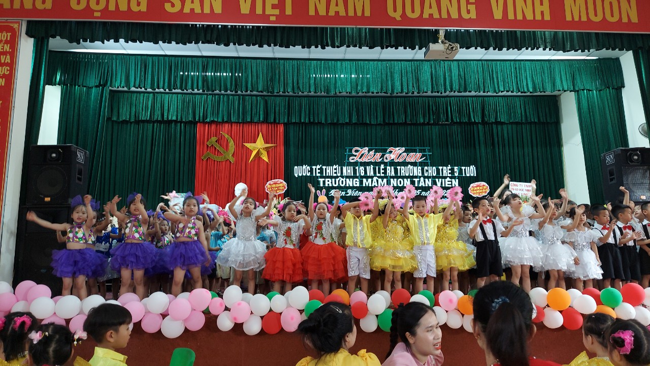 Khi cái nắng chói chang của mùa hè xuất hiện cùng với tiếng ve kêu râm ran, hoa phượng đỏ ngập trời thì đó cũng là thời điểm đặc biệt báo hiệu một năm học đã khép lại. Năm học 2023-2024 trôi qua với biết bao dấu ấn, kỷ niệm và những cảm xúc đặc biệt với cả cô và trò trường mầm non Tân Viên. Nhìn lại chặng đường năm học vừa qua, đó là chặng hành trình ghi dấu sự cố gắng nỗ lực không ngừng nghỉ trong nâng cao chất lượng chăm sóc và giáo dục của tập thể CBGV nhà trường, đồng thời đây cũng là chặng đường với biết bao sự trưởng thành của các con. Trong không khí tưng bừng phấn khởi của ngày Liên hoan quốc tế thiếu nhi 1.6 và Lễ ra trường cho trẻ 5 tuổi, cô và trò nhà trường vinh dự được đón tiếp các cô bác lãnh đạo đại diện cho ĐU - HĐND - UBND - UBMTTQVN xã Tân Viên, đại diện chính quyền của các làng văn hoá trên địa bàn xã, Ban đại diện Hội cha mẹ học sinh nhà trường. Tại buổi Liên hoan, các Đại biểu đã dành cho các bé trường MN Tân Viên những món quà ý nghĩa. Sau khi cô giáo Đặng Thị Nguyệt - ĐUV-BTCB-Hiệu trưởng nhà trường khai mạc buổi Liên hoan, Đại biểu được thưởng thức các tiết mục văn nghệ vô cùng đặc sắc và hồn nhiên của các bé. Tại buổi Liên hoan, các bé được cô giáo Đặng Thị Nguyệt - HT nhà trường tặng giấy khen Cháu ngoan Bác Hồ, các bé 5 tuổi được phát giấy chứng nhận hoàn thành chương trình phổ cập GDMN. Các đại biểu cũng được nghe những dòng tâm sự rất cảm động trước khi chia tay với ngôi nhà MN Tân Viên để bước sang một môi trường học tập mới của một bé đại diện cho các bé 5 tuổi - bé Phạm Hương Thảo Chi. Sau đây là một số hình ảnh