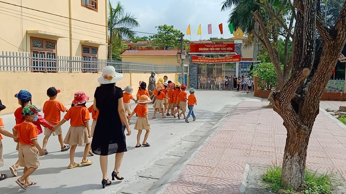 Các bé tay trong tay với trang phục gọn gàng, đi thành hàng ngay ngắn bước vào cổng trường. Niềm vui, háo hức thể hiện rõ trên những khuôn mặt ngây thơ, đáng yêu của các bé
